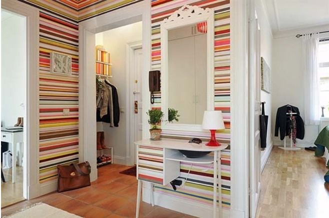 Небольшой коридор можно расширить обоями с горизонтальной полоской. Но цвета должны быть не темными, а яркими с белыми вставками. Широкие белые наличники и оттеняющий пол - увеличат помещение.
