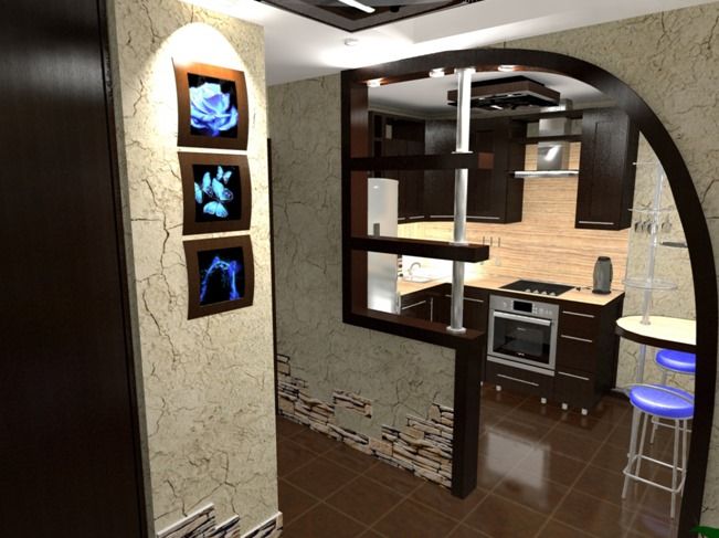 Переход из коридора в кухню обычно лежит через арку. Чтобы сделать его плавным и ненавязчивым, я советую выдержать в одной гамме хотя бы цвет пола.