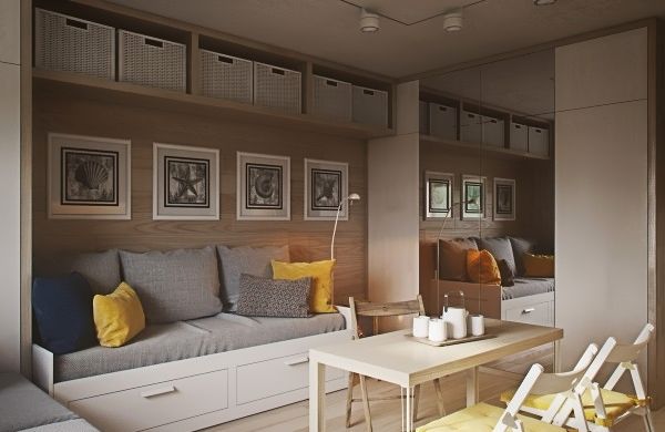 Естественно, площадь для детской придется забрать у гостиной и кухни, объединив их в одно пространство. Важно это сделать с сохранением комфорта, как в этом проекте. Уютная гостиная, рядом с которой расположилась обеденная зона и кухня с веселыми элементами. Детская же создана по морским мотивам и легко вместит двоих детей. Вот что значит настоящая оптимизация пространства!