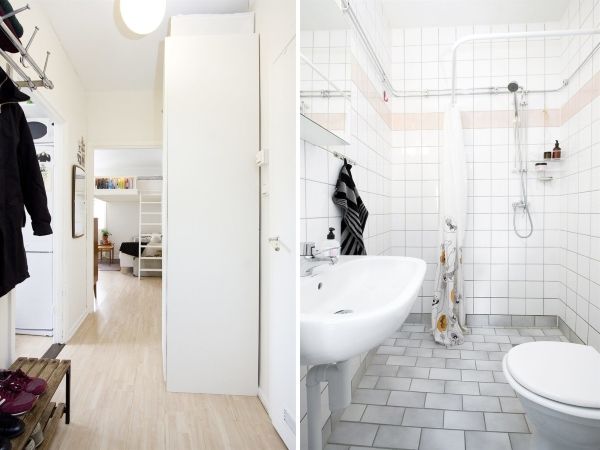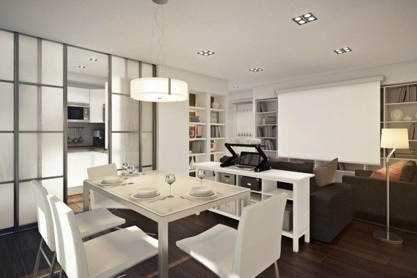 На самом деле все это поместилось на площади в 45 «квадратов». Устройство стеллажей за экраном позволяет оптимально использовать пространство, а обилие белого цвета создает ощущение дополнительного пространства. Кухня объединена со столовой и гостиной, однако при необходимости может быть закрыта сдвижной перегородкой. Зонирование в помещении гостиной осуществляется в основном расстановкой мебели и цветовым решением.