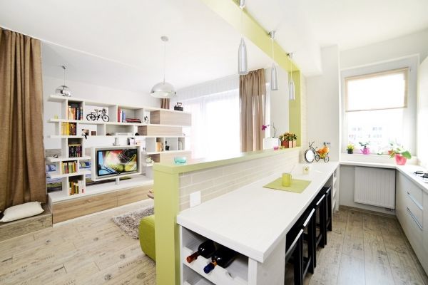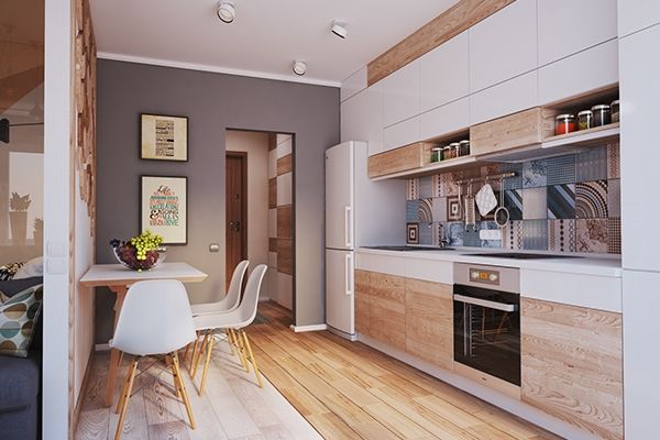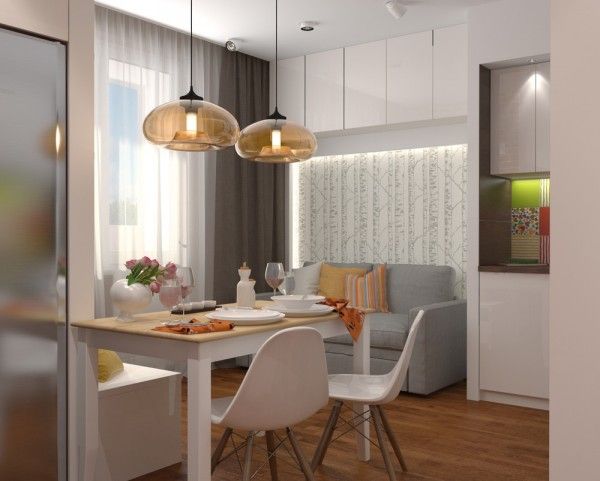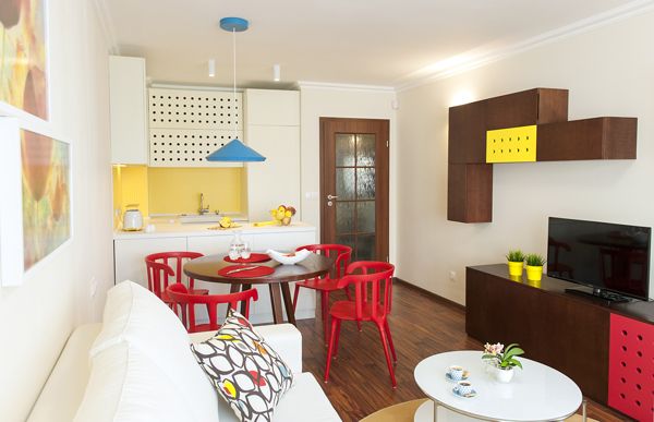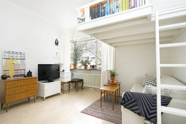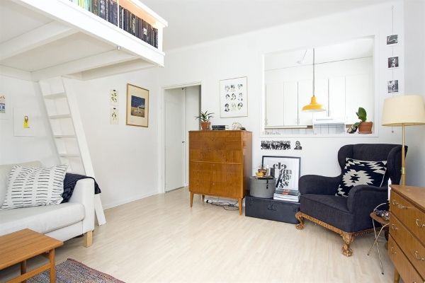 Здесь применено очень удачное решение по организации пространства в небольшой квартире – это кровать «на втором этаже». Это, безусловно, экономит пространство комнаты, позволяя на той же площади разместить и гостиную зону. Кухня в этой квартире является полноценным отдельным помещением, что может многим прийтись по вкусу.