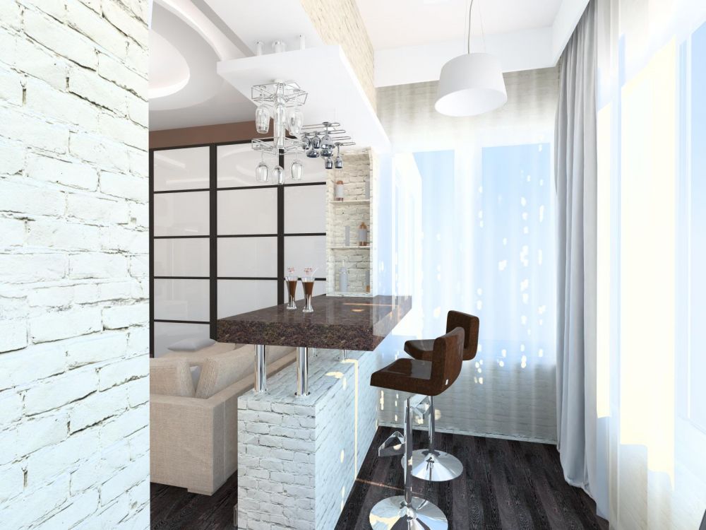 Присоединенный балкон ─ бар, светлая отделка визуально расширяет помещение