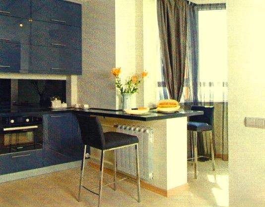 Следующие примеры помогут разобраться, как правильно использовать балкон. При присоединении к кухне межкомнатный подоконник превращают в стол. Если участок стены с батареей убрать не разрешают, можно сделать широкую столешницу или закрыть радиатор, сделать щелевой выход для теплого воздуха в стороне от сидений. За выступом поместится еще одна рабочая поверхность, продолжение обеденной зоны или даже небольшой холодильник.