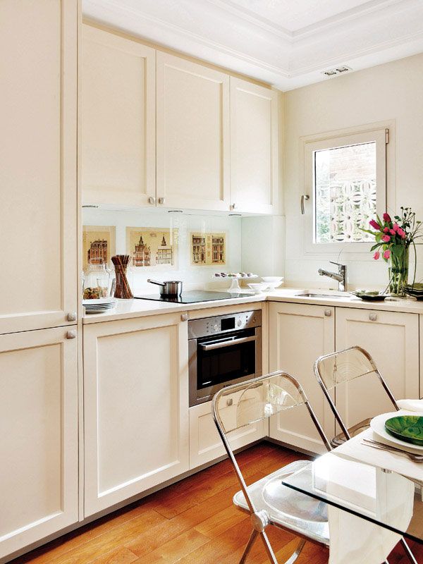На фото кухня очень миниатюрного размера, однако благодаря пастельным тонам помещение не выглядит узким и маленьким.