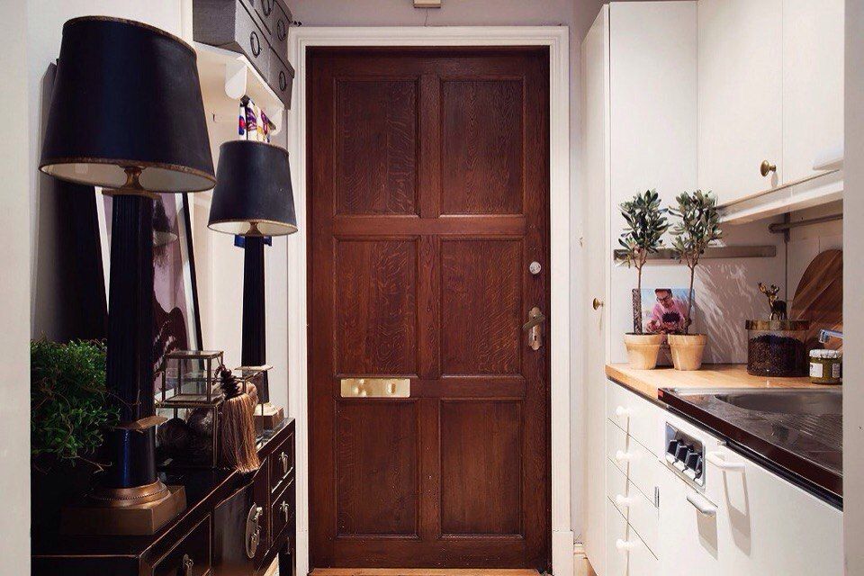 Не смотря на то, что квартира спроектирована не совсем удобно, дизайнер нашёл выход из сложившейся ситуации. Входная дверь гармонично смотрится на кухне. Кажется, будто бы это выход вовсе не на улицу, а в другую комнату. Обратите внимание, что и в этой комнате белый цвет—главный.