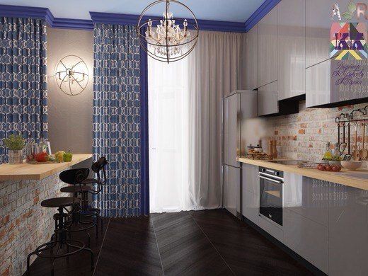 Квартира-студия выполнена в голубых и серых тонах. Однако такое сочетание ничуть не уменьшает пространства, хотя и не создаёт нового.