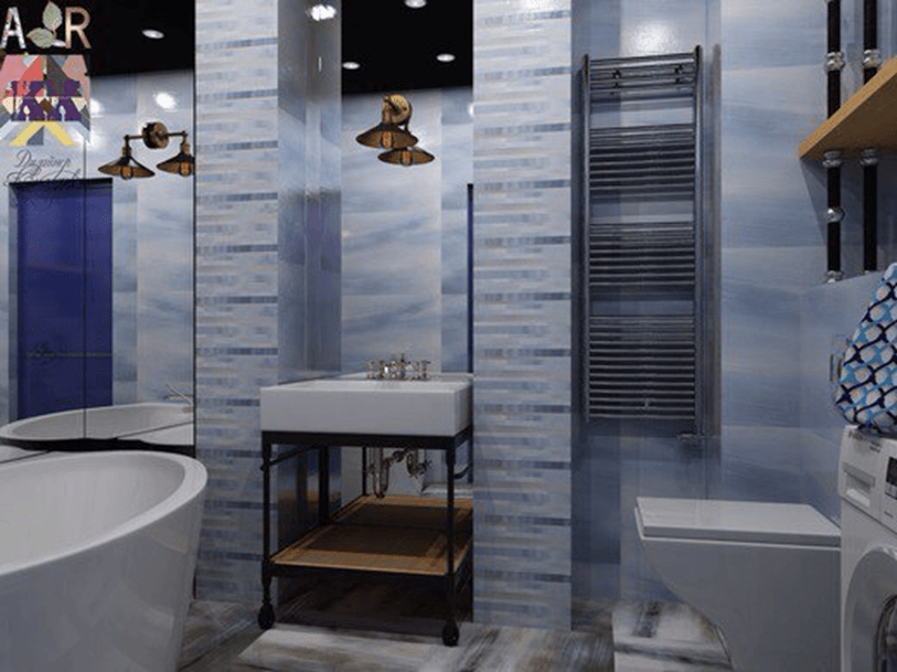 Ванна также сделана в серо-голубых тонах. Очень важно наличие зеркал—это поможет даже самое маленькое пространство превратить в большое.