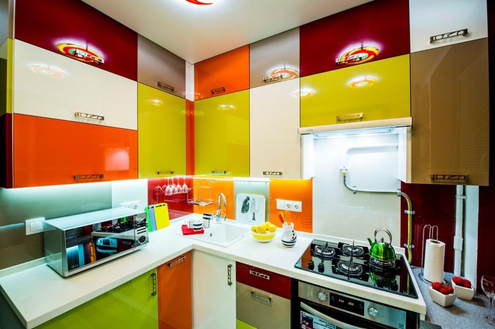 Как видно на фото, кухня не самая маленькая, однако из-за слишком ярких шкафчиков, смотрится перегруженной и разномастной.