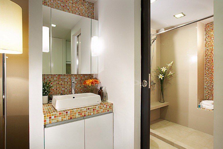 Ванная комната сделана очень необычно: умывальник стоит в коридоре, а душевая кабина—внутри. Такое размещение действительно очень удобно: в ванной комнате достаточно места, а к умывальнику всегда можно подойти.