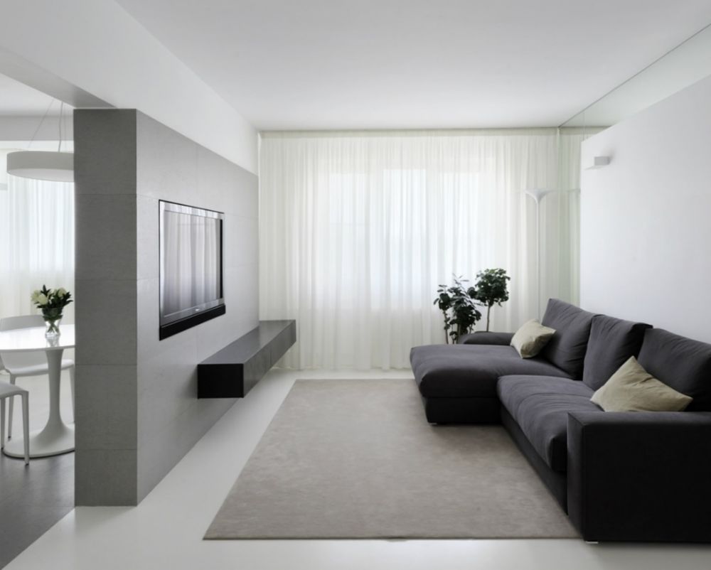 За счёт отсутствия большого количества мебели и мелких деталей, комната смотрится просторней.
