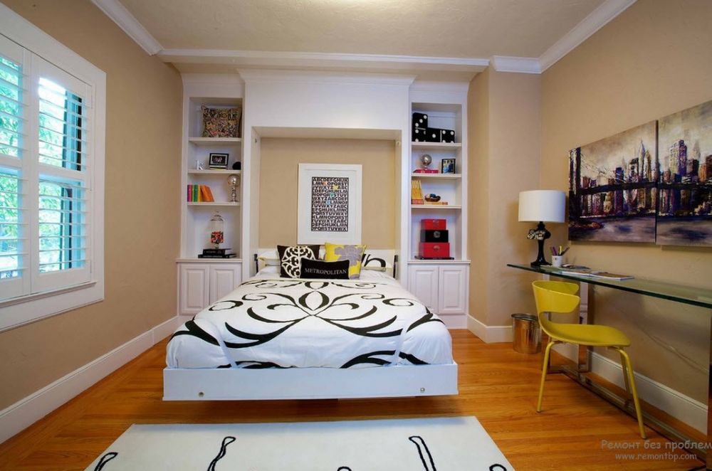 Очень интересно и компактно смотрится односпальная кровать. Для того, кто живёт один—то, что надо. А гости могут расположится на диване.