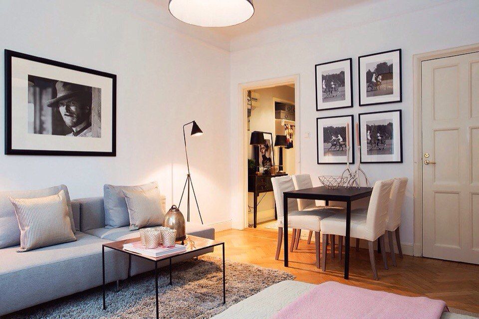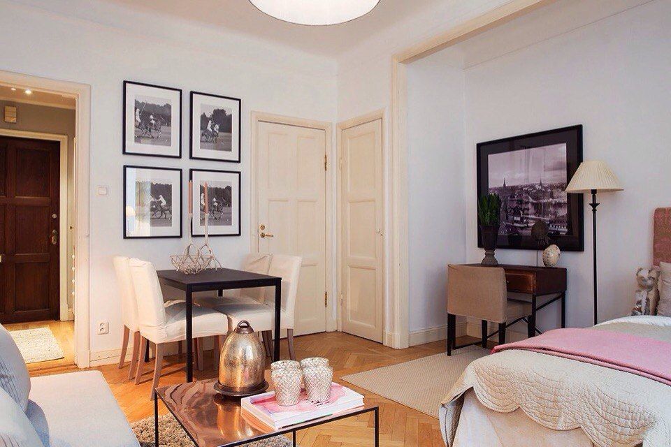 Как можно увидеть на фото, одна комната совмещает в себе и гостиную, и столовую, и спальню. Помещение не выглядит маленьким благодаря светлым оттенкам.