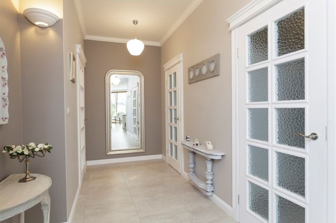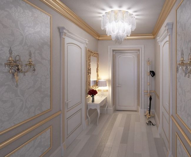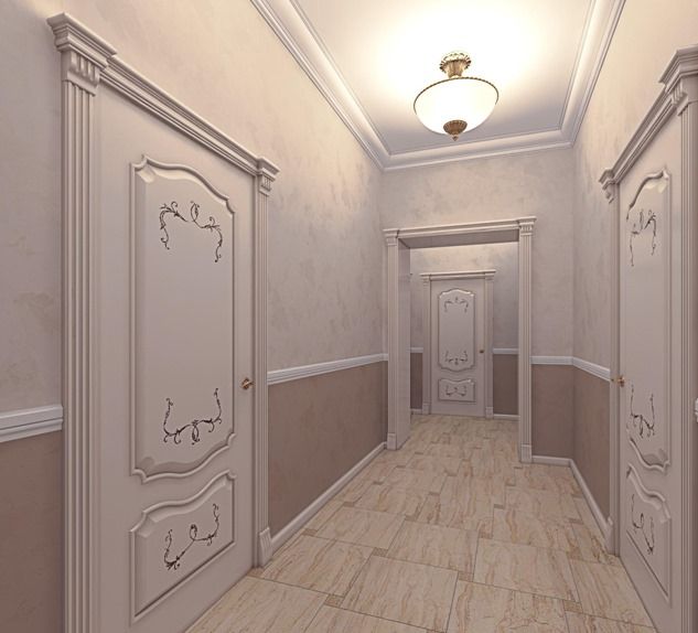 Классический дизайн широкого коридора. Пастельные цвета, плитка на полу. Главными элементами декора здесь выступают резные деревянные двери, арка, лепнины и плинтуса. Такой дизайн относят к дорогому из-за стоимости деревянных элементов. Одна только дверь может стоить больше 30 тысяч.