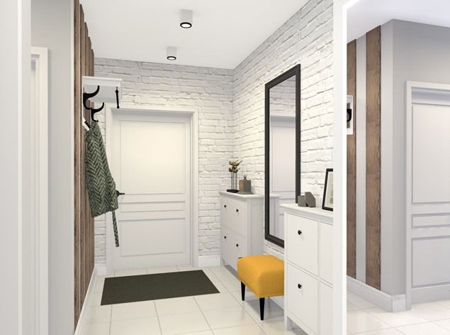 В дизайне присутствует хитрость - яркий тон на светлых стенах. Узкий желтый комод и тумба разбавляют строгую гамму. По моему опыту, очень удачный стиль для маленького коридора.