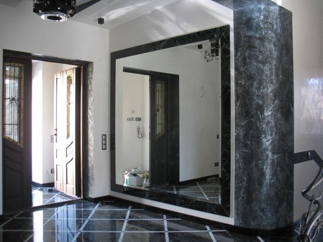 Красивые зеркала на полную высоту стены. В оформлении дизайна присутствуют стеновые панели. Они также расширяют пространство и стоят более 6 тысяч за квадратный метр.
