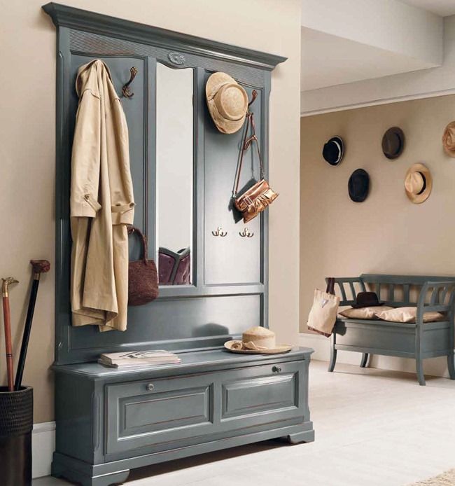 При входе стоит вешалка, а за стеной лавка, выдержанная в таком же стиле. Светлые покрашенные стены и белый ламинат подчеркивают “древность” серой мебели, которая на самом деле стоит более 45 тысяч.