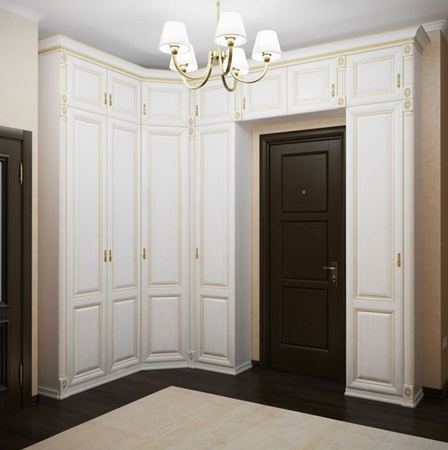 Угловой белый шкаф соединяет лишнее пространство, обращая при этом минимум внимания на себя. Светлый кафель посередине ламината венге гармонично соединяет коридор.