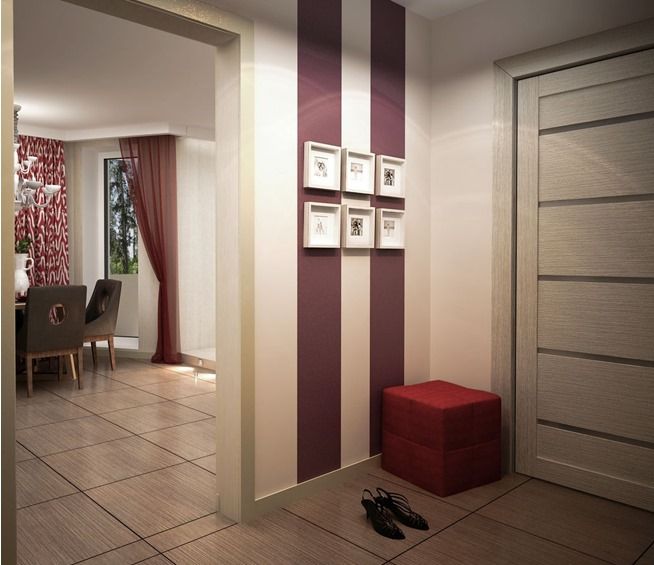 Небольшой коридор можно расширить обоями с горизонтальной полоской. Но цвета должны быть не темными, а яркими с белыми вставками. Широкие белые наличники и оттеняющий пол - увеличат помещение.