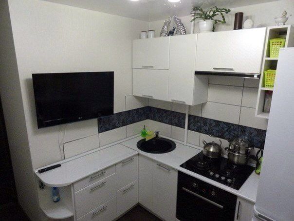 Рабочая поверхность стола должна контрастировать с стеной. На стене можно выложить полоску темного кафеля. Эффектно разбавляют светлые пятна черная плита и большой экран телевизора.