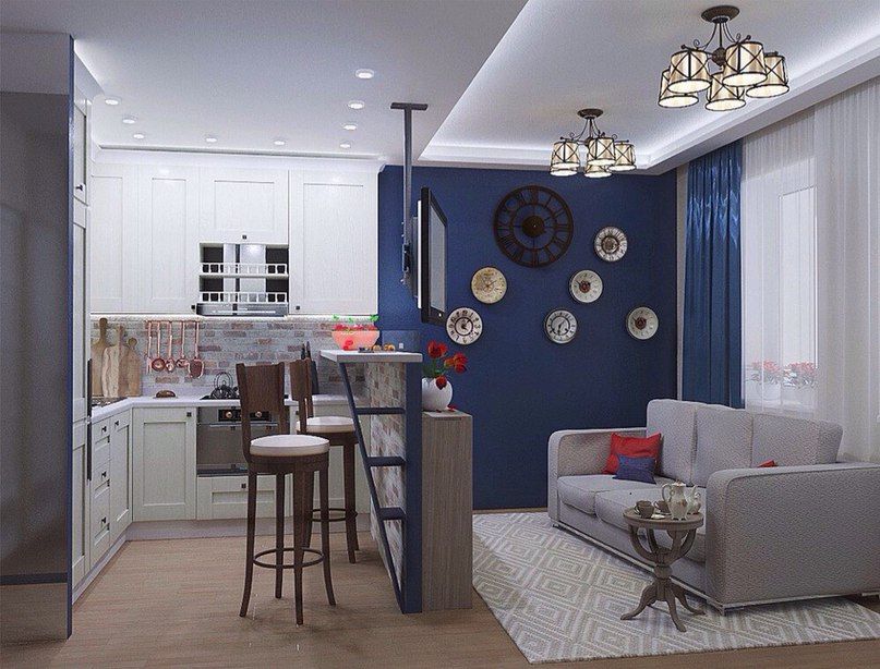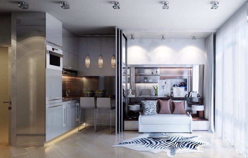 При отсутствии перегородки между комнатами их можно визуально разделить разными осветительными приборами. Эффектно выглядит использование разных стилей — хай-тек и модерн.
