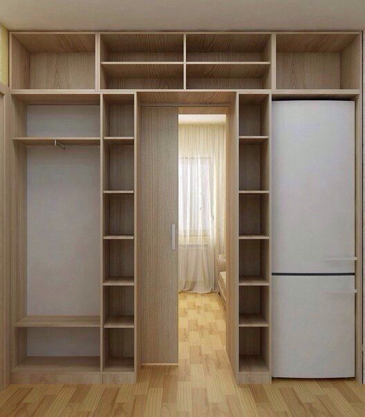 Вместо закрытых отделений можно установить модули с открытыми полками. Справа — поставить холодильник, а слева хранить ботинки и пальто.