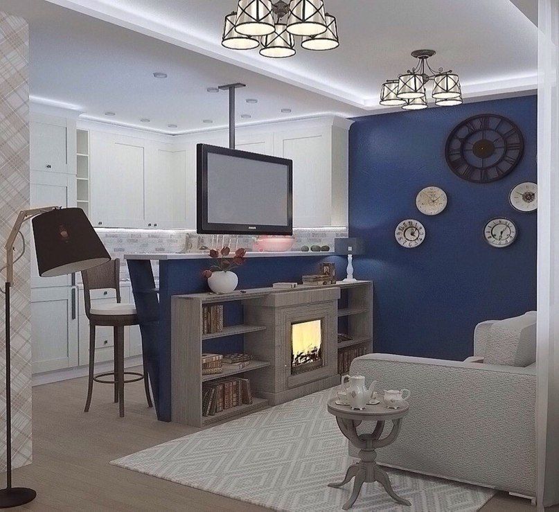 Обратите внимание — комната чуть больше предыдущей, поэтому здесь нужно расставить акценты. Темно-синяя стена оживляет помещение, на ней размещены часы в стиле минимализма. Особой похвалы заслуживает эргономичная стойка, выполняющая функции стола.