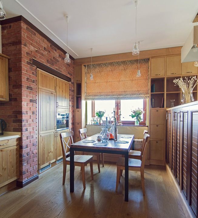 Наша прихожая ведет прямо в «столовую», ничем не отгороженную от гостиной и мини-кухни. Кирпично-деревянное место для «столования» сделали совсем небольшим, но получилось все очень светло и уютно.