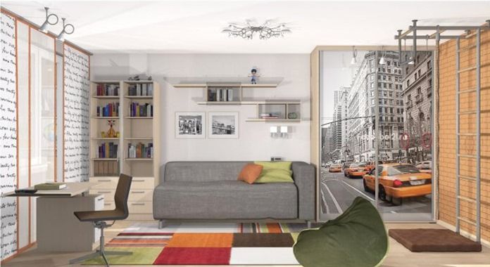 В оформлении детской ориентировались на возраст ребенка. В этом конкретном случае ребенок уже был подростком. Для детей такого возраста лучше всего подходят «независимые» стили – поп арт и лофт. Мебель подобрали с многими функциями. Кровать разместили на тумбе-подиуме, в которую можно складывать одежду и другие вещи.