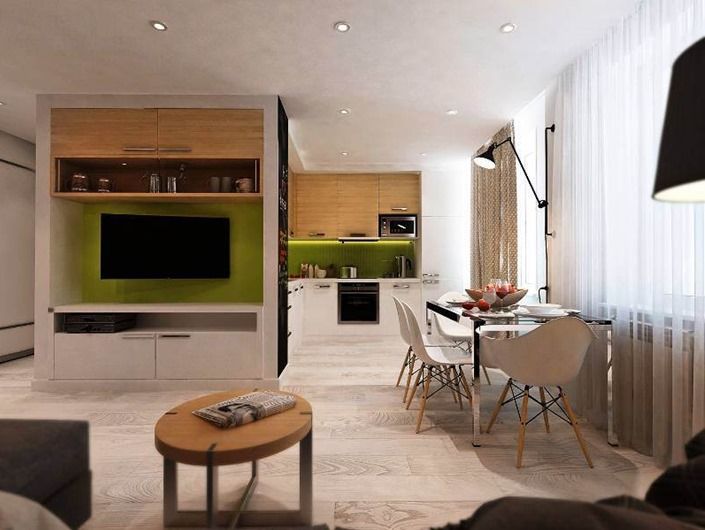 · гостиную и кухню превратили в одно сплошное пространство, где одновременно можно готовить, есть и отдыхать;