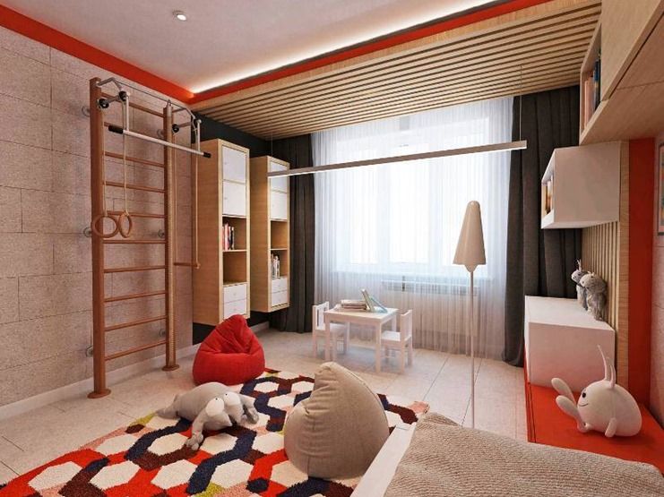 В детской преобладает бодрящий красный цвет и функциональность. Смогли найти в ней место не только для игр и мягких игрушек, но и для спорта. Понаставили шкафчиков и полок.