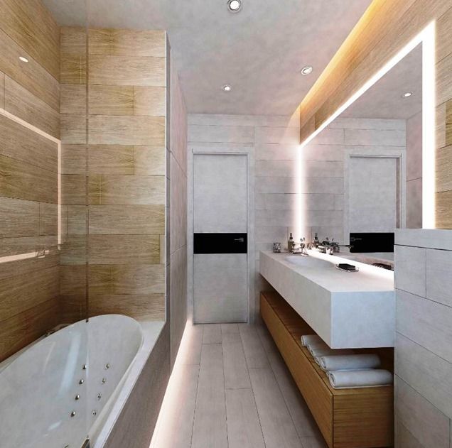 Ванна вышла маленькая, но очень стильная. Коричневато-розовые и белые оттенки в сочетании с подсвеченным зеркалом визуально раздвинули узенькое пространство. Получилось завораживающе.