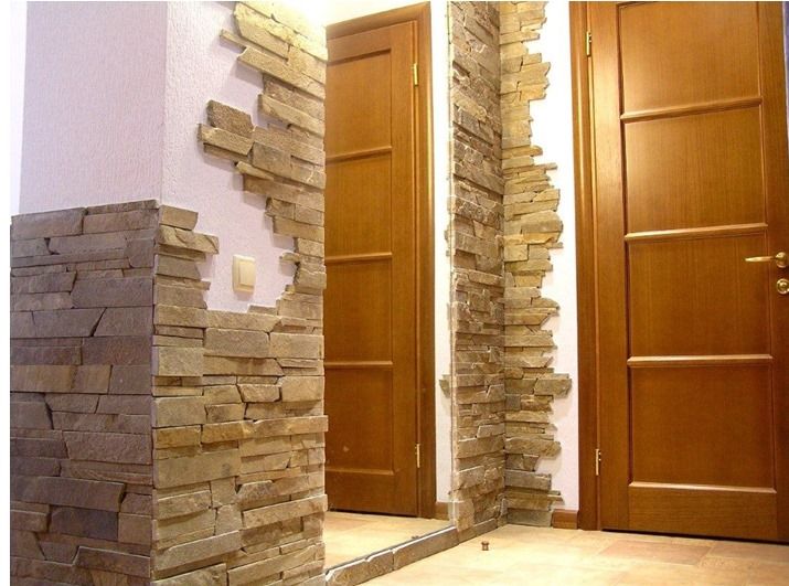 камень. Его лучше класть вместе со штукатуркой. Особенно хорошо он смотрится в дверных проемах;