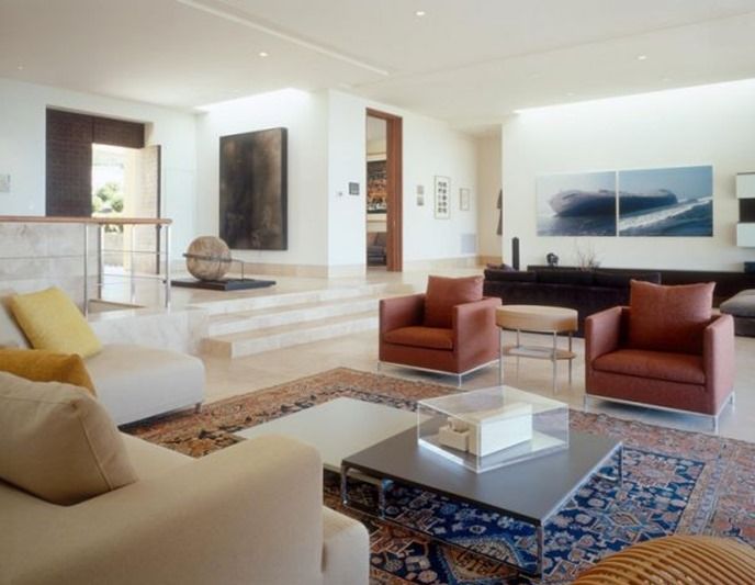 создать микс можно даже и без кардинальных изменений. Просто добавляем что-нибудь нетипичное для того или иного стиля. К примеру, добавили ковер с графикой и яркий диван. Это создало интересную смесь классики и контемпорари.