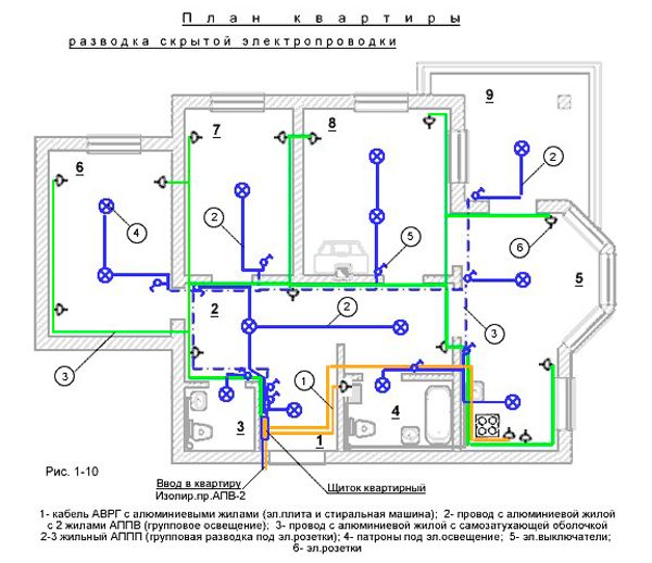 Приблизительная схема электропроводки в квартире с указанием зоны прокладки, выключателей и розеток