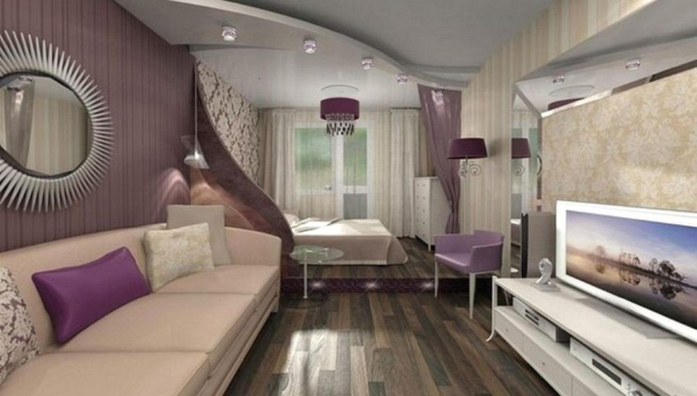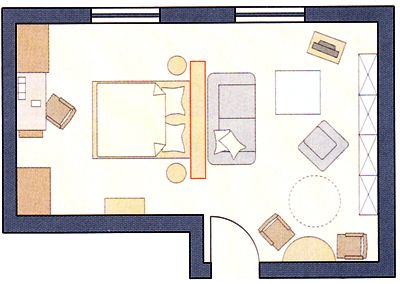Уместнее всего, если гостиная-спальня в одной комнате, полагают специалисты, будет поиграть с цветом, поскольку громоздить объемные предметы мебели, чтобы разделить территорию, не совсем к месту.