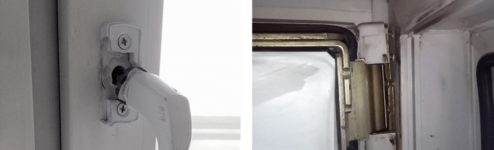 - Открывайте створку. На торце на всех или хотя бы трёх сторонах должны находиться металлические пластины. Их отсутствие – признак металлической фурнитуры с пластиковыми составляющими. Либо она вся из пластика. Её срок службы очень скромен. Часто она не дотягивает и до завершения гарантийного периода.