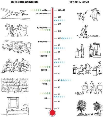Ниже схематически указано соотношение звукового давления и уровня шумов.