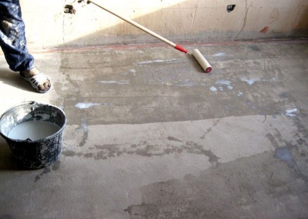 Дальше пол в помещении покрывается грунтовкой. Благодаря ей пол лучше схватывается с основанием. Грунтуем в два слоя минимум. Второй слой наносим только после абсолютного высыхания первого слоя. Грунтование продолжается, пока ещё поглощается основанием.