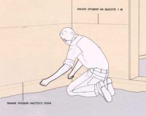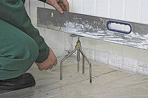 На этой стадии уровень. С ним проходимся по помещению. А на стенах делаем горизонтальные метки. На них будем опираться в процессе заливки