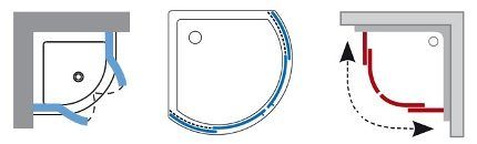 - Если ванная скромна по площади, выбирайте угловую модификацию с поддоном, форма которого обозначает четверть круга. Обычно его стороны имеют длину 80-100 см. Подходящий тип дверок – раздвижные.