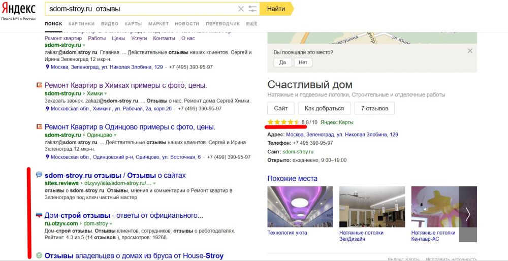Вот пример нашей репутации, по ссылке https://yandex.ru/yandsearch?text=sdom-stroy.ru отзывы&lr=213&clid=2186618 вы можете почитать отзывы о нас на сторонних сайтах