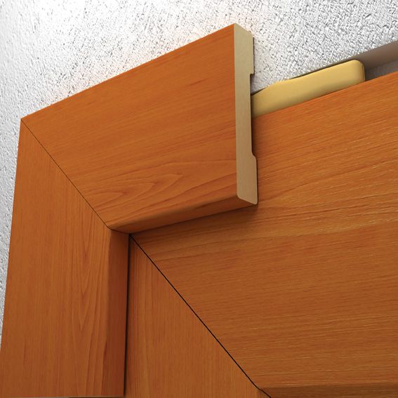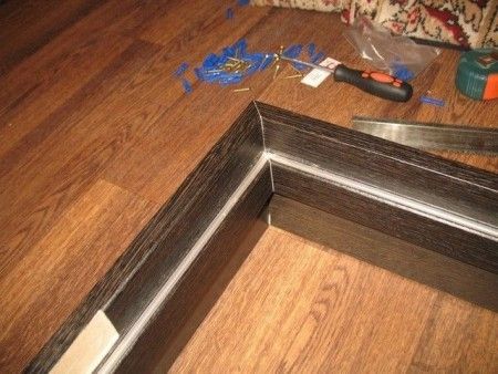 - Прибиваем наличники к коробке. Используем гвозди со спрессованной шляпки. Соединение планок – встык, под углом 45 градусов. Планки прибиваем по периметру всей двери. Шаг – 20-25 см.