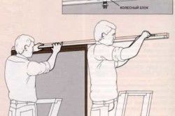 - Укрепляем перемычку – ставим ещё одни стойки. Перемычку скрепляем с потолком.