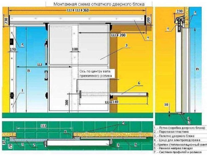 Навешиваем дверь на НЭ (бегунки размещаем в пазе). Конструкцию крепим к верху проёма по готовому обозначению.