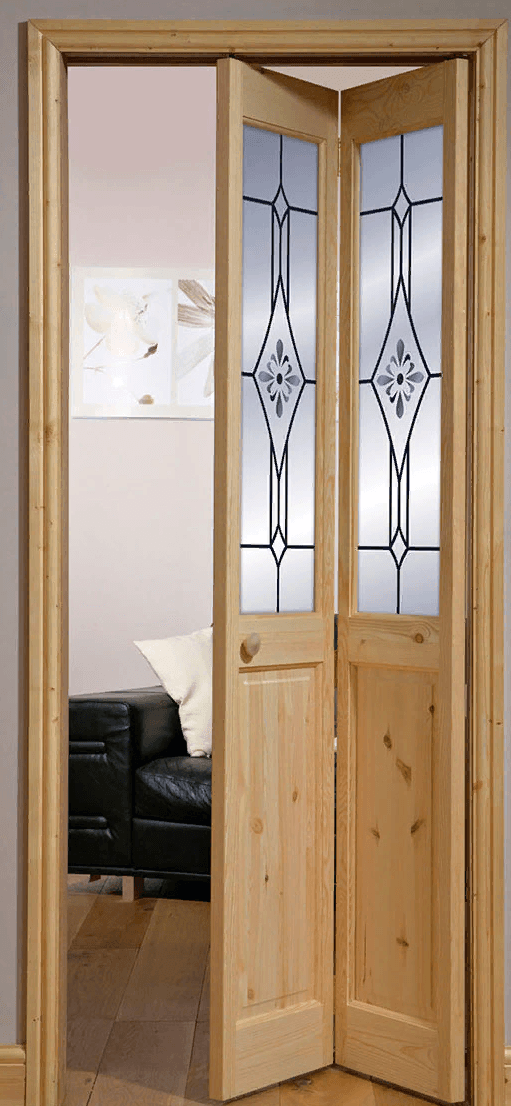 Раскладные двери. По формату – это гармошка. Её образуют створки, соединённые шарнирным способом. Когда такие двери закрываются, то поворачиваются по окружности вертикального стержня. В крайней позиции они параллельны друг другу.