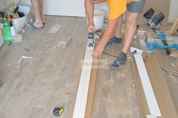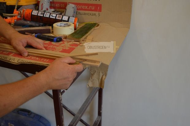 Поворачиваем добор обратной стороной. Устраиваем четверть. Так добор поместится в коробке. Запиленную часть спрячем.