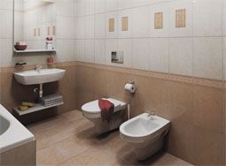 Я придерживаюсь устоявшихся взглядов на дизайн ванной и туалета, поэтому рекомендую покупать плитку одной цветовой гаммы. Более темная пойдет на нижнюю половину стен и под потолок, а светлая станет основным фоном санузла. Подчеркнуть индивидуальность можно декором из той же коллекции, что и вся плитка.