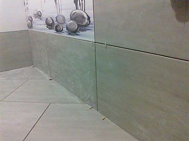 - подсовывать напольную плитку под стеновую в местах стыков – значит нажимать на ее край, и у вас получится небольшой уклон в сторону стен по всему периметру, где будет скапливаться влага;