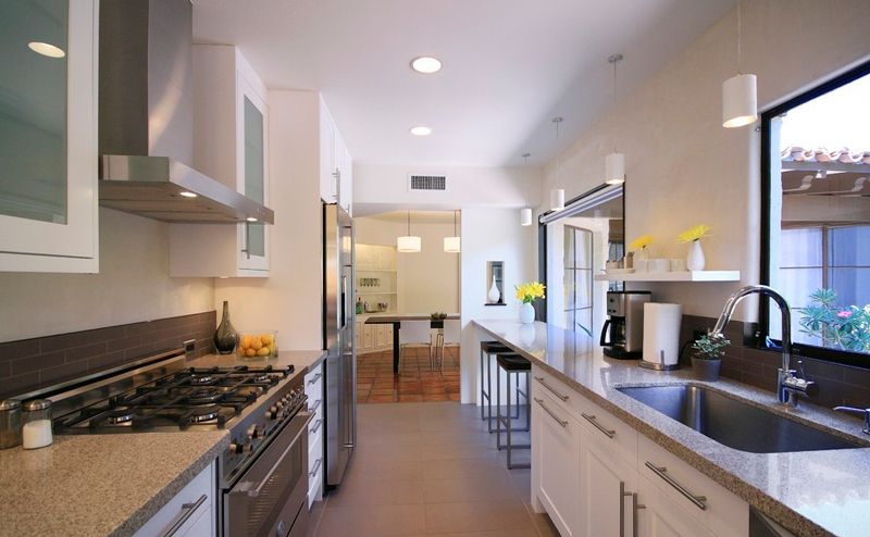 А в большом помещении можно зонировать пространство линейной кухни, используя различные материалы для полового покрытия, или другие приемы – все зависит от выбранного дизайна.