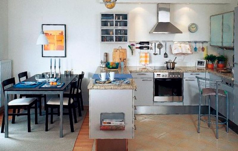 - Расстояние между рабочей зоной и обеденным столом не должно быть меньше метра, чтоб обеспечить свободное перемещение по кухне;